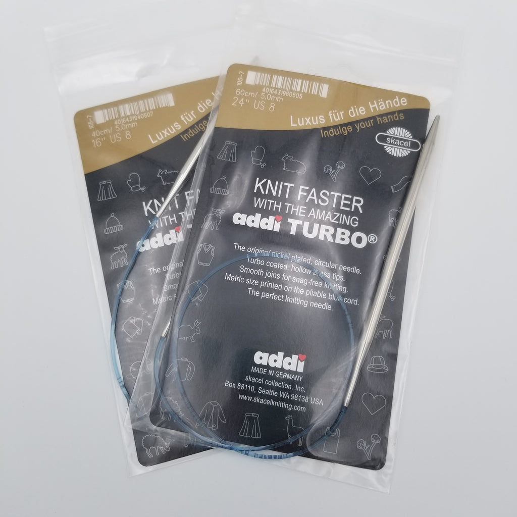 addi Turbos are a marriage of brilliant engineering with every knitter’s dream. addi’s breakthrough design features a hollow brass core that offers strength and very light weight; the turbo plating provides a smooth ride for your stitches; and addi’s cable is the one that raised the bar for everyone – – here at last is a cable that is flexible, strong and never coiled or kinked. No wonder we all love addi’s so much.