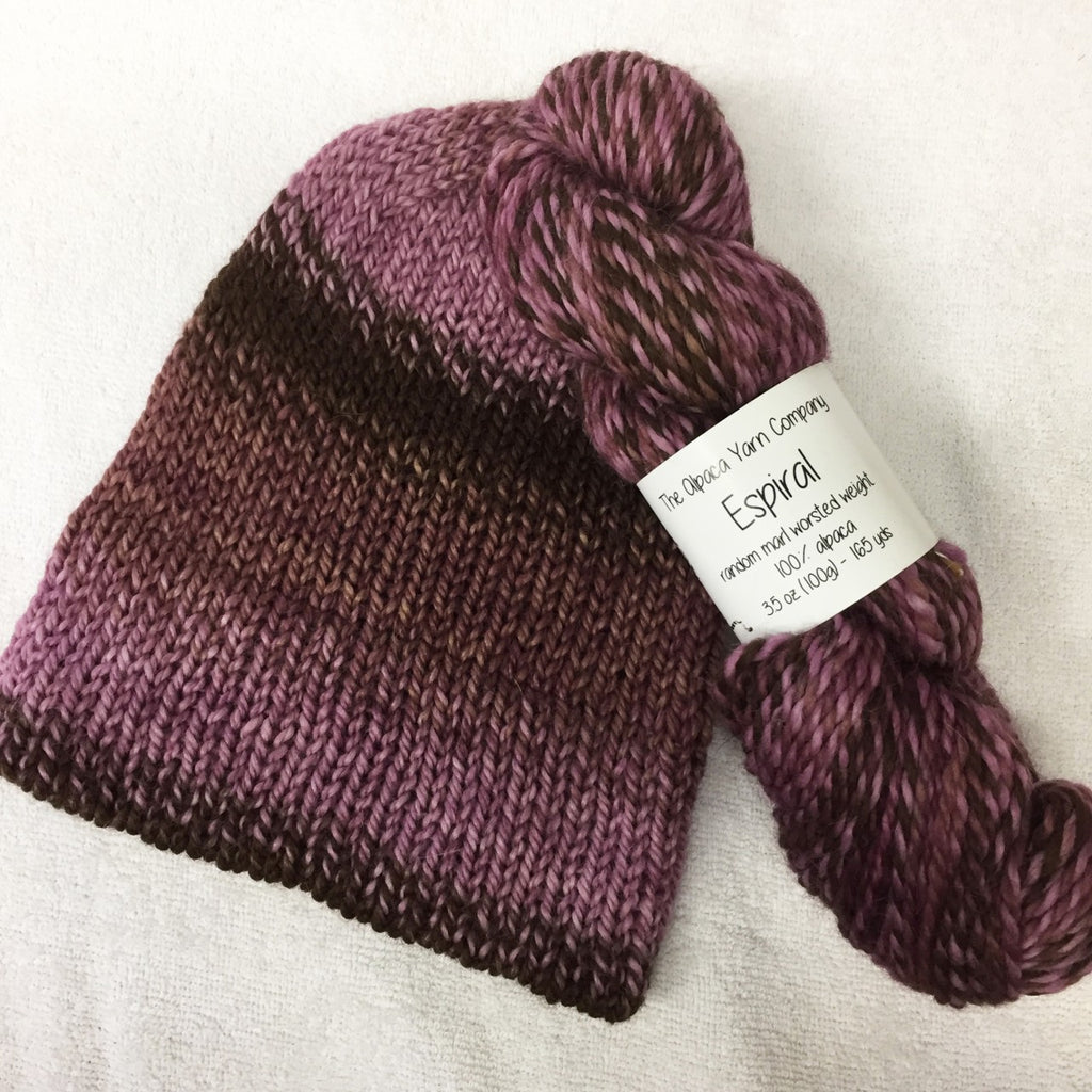 Espiral is The Alpaca Yarn Company's newest and long awaited yarn that gives the look of a random handspun skein. Each skein is different in it’s beauty so working with it will always be exciting. This soft, 2 ply yarn is 100% alpaca in a worsted weight. Each 100 gm skein is approximately 165 yards. The gauge is approximately 4-5 st/1″ using US #7 or 8 needles.