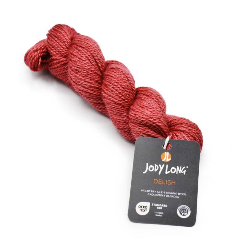 Jody Long's Super Fine weight yarn, aptly named Delish, is a luxurious blend of 50% Extrafine Merino Wool and 50% Mulberry Silk, combining softness with a subtle sheen. Perfect for delicate projects requiring intricate details, this yarn boasts exceptional quality and a sumptuously smooth texture. Each skein weighs 50 grams and offers a generous yardage of 230 yards, ensuring ample material for your creative endeavors. Whether knitting intricate lace patterns or crafting lightweight garments, Jody Long's Super Fine yarn promises elegance and sophistication in every stitch.
