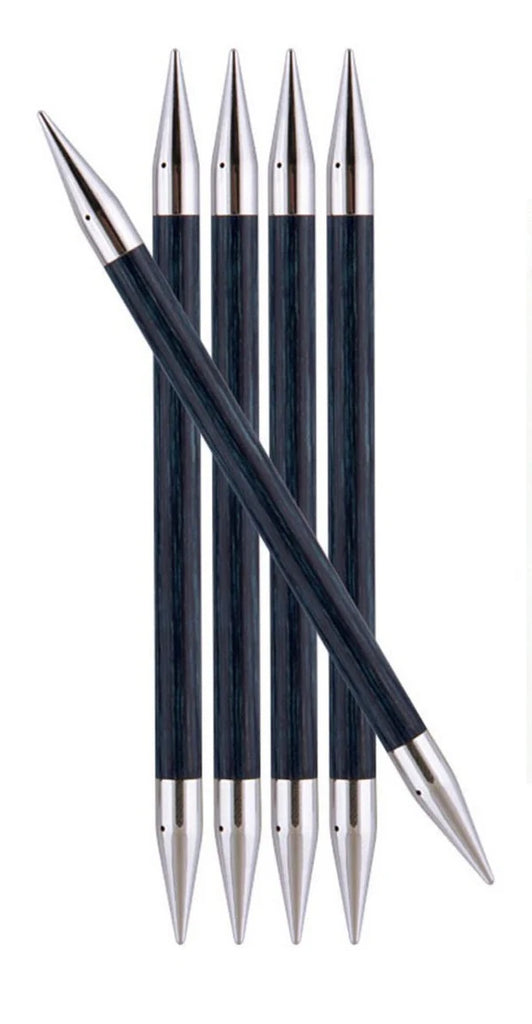 Knitter's Pride Royale Double Pointed Needles are made from colorful wood with shiny chrome-plated brass tips adorning the ends of the needles. Each size comes in its own unique color, making it easy to identify. The unique combination of wood and metal not only gives a refined look to the needles, but also provides an incomparable knitting experience. They are color-coded by size making it easy to identify and organize your needle pairs. Needles come in sets of 5.