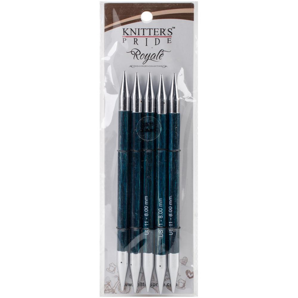 Knitter's Pride Royale Double Pointed Needles are made from colorful wood with shiny chrome-plated brass tips adorning the ends of the needles. Each size comes in its own unique color, making it easy to identify. The unique combination of wood and metal not only gives a refined look to the needles, but also provides an incomparable knitting experience. They are color-coded by size making it easy to identify and organize your needle pairs. Needles come in sets of 5.